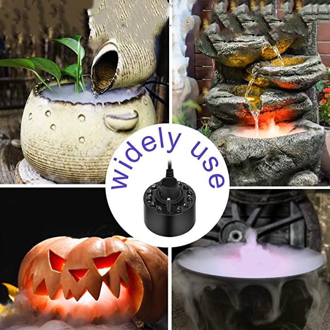 🎃 EASY TO OPERATE AND SAFE.You do not have to put anything just water,Plug in the power supply and place it in a water container with 40~80mm water depth.The input voltage is 24V, which is the safe voltage.So it’s safe to used in the water. Just using your imagination and you will find a lot of fun when use this mist generator.